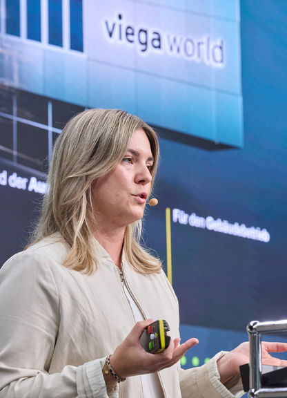 Keynote-Speakerin Isabel Hammerschmidt, Engineering Consultant bei Viega und Expertin für Digitales Bauen und Nachhaltigkeit, betonte, dass „heute mehr denn je die Technische Gebäudeausrüstung (TGA) in Kombination mit digitalen Planungsmethoden als integraler Bestandteil in Bauplanung und