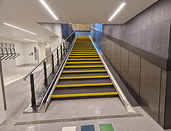 Das VeloComfort® Transportband auf Kevlar-Basis führt durch einen doppelseitigen Kanal aus Aluminium. Der Antrieb läuft mit Elektromotor und wird durch einen integrierten Sensor aktiviert. Erhältlich in zwei Modellen, ermöglicht das Förderband den Transport von Fahrrädern mit Reifenbreiten bis zu 60 mm oder bis zu 130 mm und kann an Treppen mit Neigungswinkel bis 35° installiert werden. Die VeloComfort® Bürstenschiene erleichtert den Abwärtstransport. Diese Abwärtsrinne ist beidseitig mit Bürstenleisten und einer Mulde versehen. Sie bremst das Fahrrad, egal wie schwer, auf das gewünschte Tempo ab. Die Bürstenschiene kann mit einem Wandabstand von mindestens 35 cm an Treppen jeglicher Neigung montiert werden. Die Edelstahl-Fahrradschiene mit U-Profil ist für beidseitigen Fahrradtransport auf- und abwärts geeignet. Hier muss das Rad mit Körperkraft bewegt werden, ein werksseitiger Antirutschbelag sorgt für den nötigen Grip.