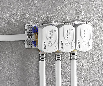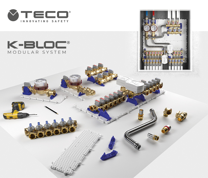 Flexibilität, Zweckmäßigkeit und schnelle Installation: Das sind die Stärken von K-BLOC®, dem modularen Montagesystem von TECO, das sich präzise an alle Anforderungen der Sanitär- und Heizungsverteilung anpasst.