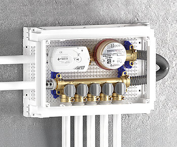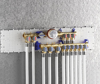 Sanitärverteilergruppe (Warmwasser: Verteiler mit Ablesung und Zirkulation – Kaltwasser: Verteiler und Abzweigungen für andere Bereiche)