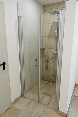 Bevor die Montage der Duschkabine beginnen kann, wurde vor Ort das genaue Aufmaß genommen, um sicherzustellen, dass die Dusche perfekt in das Badezimmer passt. Die Gegebenheiten im Bad - insbesondere die Fliesen und der vorhandene Platz - wurden sorgfältig berücksichtigt. Der Hausherr und der zuständige Fachhandwerker haben die Entscheidung getroffen, anstatt zu bohren, die Dusche zu kleben.