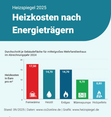 Der aktuelle Heizspiegel von co2online bestätigt, dass Pellets bei jeder Wohnfläche bis 500 m² die günstigste Wärmelösung sind. Für größere Flächen fehlen Daten, weshalb Pellets dort nicht aufgeführt sind. Am Beispiel einer 70-Quadratmeter-Wohnung im Mehrfamilienhaus konnten im Vergleich zur Fernwärme bis zu 610 Euro bzw. 50 Prozent pro Jahr eingespart werden – gegenüber Erdgas und Heizöl jeweils 415 Euro bzw. 40 Prozent. Die Erhebung bezieht sich auf tatsächlich entstandene Kosten im Jahr 2024, beispielsweise aus der Heizkostenabrechnungen. Für 2025 prognostiziert co2online die niedrigsten Heizkosten mit einer Wärmepumpe, knapp gefolgt von Pellets.