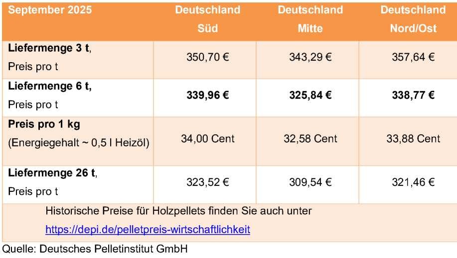 DEPI-Pelletpreis September 2025 6 t bundesweit: 335,04 €/t