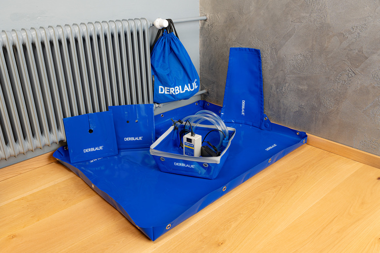 Die Unterlegwanne – erhältlich in zwei Größen – schützt Böden und Umgebungen zuverlässig vor Tropfwasser, Öl oder Schmutz. Gefertigt aus dem für DERBLAUE® typischen Spezialmaterial und mit hochklappbaren Rändern – ideal für Wartungs- und Reparatureinsätze beim Kunden.
