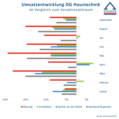 Das Jahr 2024 bleibt auch nach neun Monaten weiterhin herausfordernd für den Haustechnik-Großhandel in Deutschland. Eine anonyme Datenerhebung unter den Mitgliedern des Bonner Verbandes zeigte im September eine leichte Annäherung an die „Null-Linie“ über alle Warenbereiche hinweg, was im Vergleich zum Vormonat eine leichte Trendumkehr signalisiert.