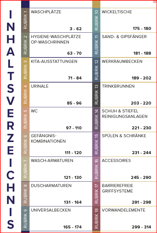 Von A wie Abfallbehälter oder Armatur bis W wie WC oder Waschrinne ist alles dabei, was im gewerblichen- und öffentlichen Sanitärbereich benötigt wird.