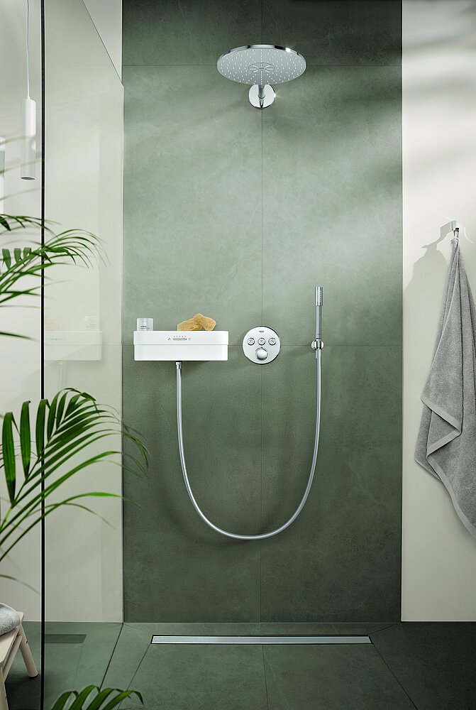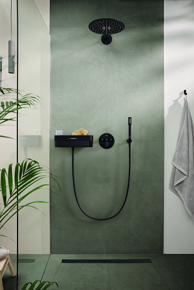 Das minimalistische Design von GROHE Purefoam fügt sich harmonisch in jede Badezimmereinrichtung ein. Das System ist in elegantem Schwarz oder zeitlosem Weiß erhältlich, während die stilvolle Glasplatte als praktische Ablage dient. Verbraucherinnen können das Produkt je nach Bedarf separat oder im Set mit GROHE Unterputz- und Aufputz-Duschsystemen erwerben. Als Einzellösung und im Set mit Aufputz-Duschsystemen wird das System mit einer runden Handbrause mit großzügigem 110-mm-Durchmesser geliefert. Diese ist besonders langlebig und mit einem ShockProof-Silikonring ausgestattet, der sie vor Fallschäden schützt. Zudem verfügt sie über zwei Strahlarten für eine noch größere Personalisierung der Wellness-Routine: der entspannende Rain-Strahl und der massierende Jet-Strahl. Im Set mit einem Unterputz-Duschsystem ist GROHE Purefoam mit einer Stabhandbrause inklusive Rain-Strahl kombiniert.