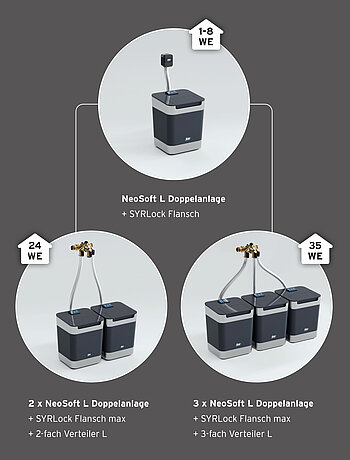 Optisch unterscheiden sich die Einzelanlage und die Doppelanlage der NeoSoft L Produktlinie nicht. Der Unterschied liegt in der Anwendung. Während die NeoSoft L Einzelanlage bis zu drei Wohneinheiten mit weichem Wasser versorgen kann, ist die NeoSoft L Doppelanlage die Basis für drei smarte Enthärtungslösungen: Eine Doppelanlage deckt bis zu acht, zwei Doppelanlagen bis zu 24 und drei Doppelanlagen bis zu 35 Wohneinheiten ab. Mit der gleichen Anlage können so drei Anwendungsfelder abgedeckt werden. Zusammen mit den bereits etablierten Features der SYR Produkte bietet die neue NeoSoft L Doppelanlage umfassende Vorteile: 1. Einfache Lagerhaltung durch eine Basisanlage für drei Enthärtungslösungen, 2. Schnelle und sichere Installation dank SYRLock Flansch, 3. Kombinierbarkeit mit weiteren Produkten der SYR L Serie über den Sandwichflansch, 4. Erweiterung der Leistung durch Kombination von zwei bis drei Doppelanlagen über den SYRLock Flansch Max und einem 2- bzw. 3-fach Verteiler L.