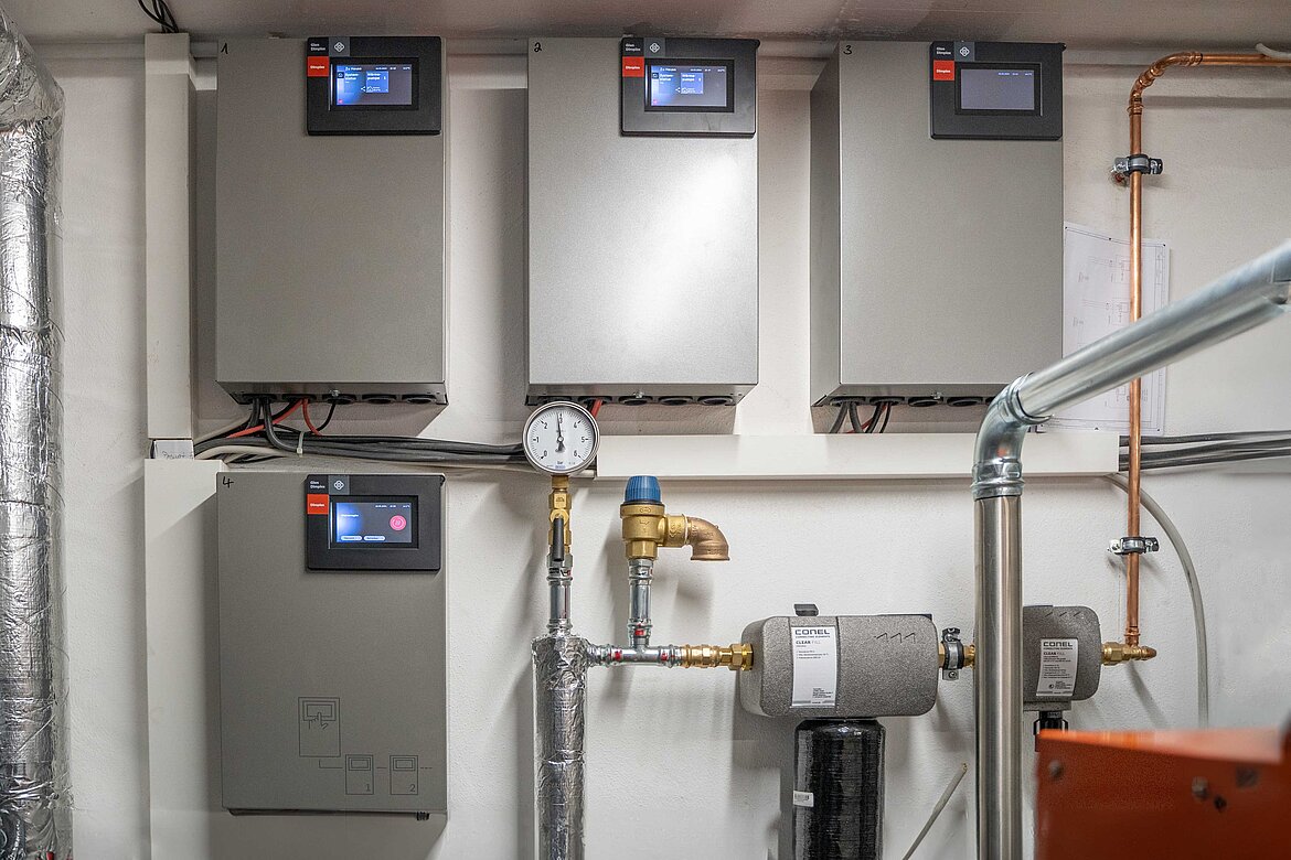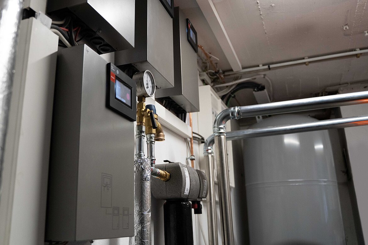 Zum Einsatz kamen dabei drei Dimplex System C LA 60S-TU Wärmepumpen, die flexibel aufstellbar und speziell für Großprojekte, wie z.B. Mehrfamilienhäuser oder Bürogebäude, ausgelegt sind. Dimplex-Außendienst Christian Hammacher, Sachkundiger für Wärmepumpensysteme nach VDI 4645, hat das Projekt betreut und erklärt, warum unter den örtlichen Gegebenheiten die Wahl auf dieses Wärmepumpenmodell fiel: „Die LA 60S-TU kann einen Gebäudewärmebedarf von bis zu 60kW decken und Vorlauftemperaturen von bis zu 60 °C bereitstellen. Beim Heizen wird ein COP bis 4,9 erreicht – und somit auch hohe Jahresarbeitszahlen. Die Leistungsregelung erhöht die Effizienz bei geringem Wärmebedarf – die Betriebskosten fallen dadurch entsprechend niedrig aus.“ Die Warmwasserbereitung erfolgte bereits vor der Umstellung dezentral und elektrisch: Elektronische Durchlauferhitzer in jeder Wohnung liefern direkt und ohne lange Wege warmes Wasser in Küche und Bad.