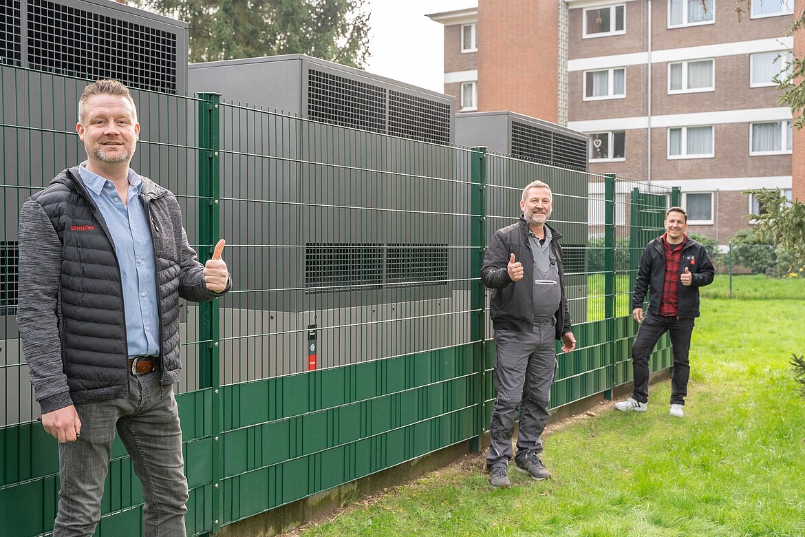 Zufriedene am Bau Beteiligte: (von links nach rechts): Christian Hammacher, Dimplex Außendienst. Per Christensen, Heizungsbauer und Thomas Kleinmanns, Dimplex Werkskundendienstleiter.
