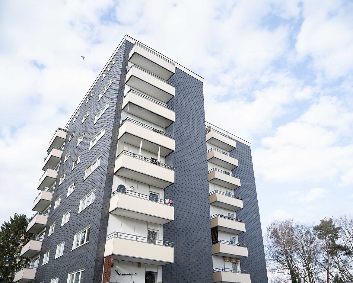Der achtstöckige Komplex, Baujahr 1966, mit 32 Wohneinheiten in einer Hochhaussiedlung nahe Düsseldorf hat durch seine noch originale Schieferverkleidung zwar eine besonders markante Optik – mag aber auf den ersten Blick nicht als „Idealobjekt“ für eine Modernisierung mit Wärmepumpen gelten. Schließlich geistern noch immer Vorstellungen von vermeintlichen Voraussetzungen wie „Fassadendämmung“ und „Fußbodenheizung“ durch die Köpfe, wenn es um das Thema „Wärmepumpe in der Sanierung“ geht. Beides erfüllt das Mehrfamilien-Hochhaus in Hilden nicht: Die 32 Wohneinheiten sind mit Stahlradiatoren-Heizkörpern ausgestattet, eine Fassadendämmung kam angesichts der erhaltenswerten Schieferverkleidung nicht in Frage.