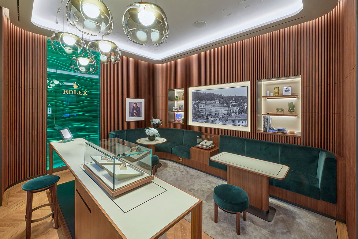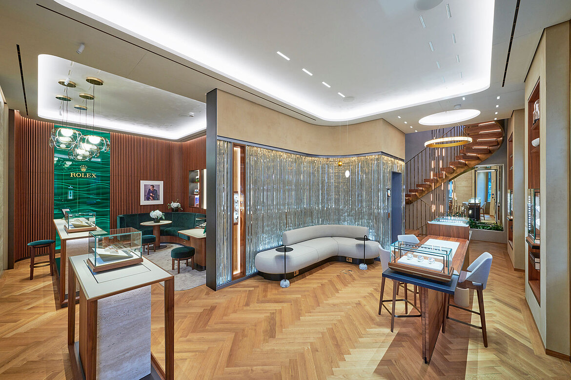 Für die 2024 eröffnete Boutique wurde ein denkmalgeschütztes Haus in der Nähe der Bieler Altstadt aufwendig restauriert und in seinen ursprünglichen Zustand zurückversetzt. Um die vielen Details des Gebäudes so authentisch wie möglich zu erhalten, setzte das verantwortliche Studio Gebert Architekten auf zahlreiche hochwertige Naturmaterialien, darunter Lehm, Kalkputz und Leinölfarben. Im Inneren bilden Holz, Fischgrätparkett, von Hand verlegte Strohmarketerie und Prismen aus Glas ein kunstvolles Interieur. Herzstück von Art du Temps ist eine freischwebende Wendeltreppe, deren Geländer von einem maßgefertigten Kronleuchter erhellt wird und mit Messing verkleidet ist. Der warme Goldton ist überall in den Räumlichkeiten zu entdecken und sorgt so für ästhetische Kontinuität und Raffinesse.