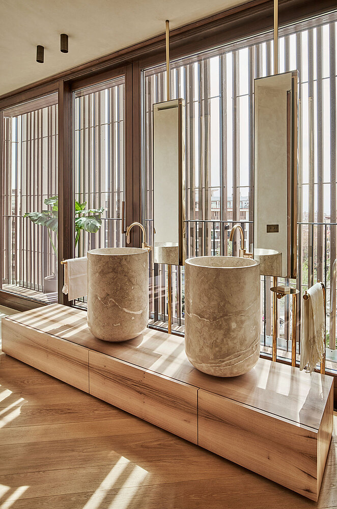 In den Bädern von Paseo Mallorca 15 hat das Architekturstudio OHLAB maßgefertigte Waschtische aus Naturstein, Messingspiegel, Seifenschalen und Handtuchhalter entworfen: Zusammen mit Tara von Dornbracht in Messing gebürstet (23kt Gold) sind so hochästhetische Ensembles entstanden (Copyright: José Hevia).