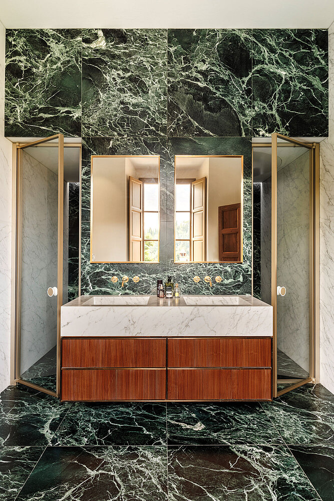 Villa il Gioiello, ein modernisiertes Renaissance-Juwel in der Toskana: Einen entscheidenden Beitrag zur Ästhetik der Bäder leisten weißer Carrara- und schwarzgrüner Verde delle Alpi-Marmor, außerdem Walnussholz. Gemeinsam mit den Vaia-Armaturen in Gold gebürstet (23,9kt) schaffen sie eine dezent luxuriöse Atmosphäre. Die ausgewogenen und elegant reduzierten Formen der von Sieger Design entworfenen Armaturen tragen ihren Teil dazu bei, Alt und Neu miteinander zu verbinden. (Copyright: Pierattelli Architetture, Fotograf: Iuri Niccolai).