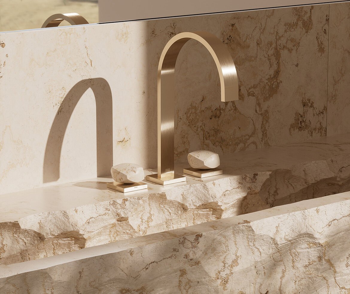 Die erste Atelier-Edition „The Rock“ von Dornbracht, individuell interpretiert: Organisch geformte Steingriffe, die per Hand geschliffen, poliert und veredelt werden, und so jedes Stück zum Unikat machen. Die Griffe sind aus hellem Travertin gefertigt, demselben Naturstein, der auch den Waschtisch prägt. Gemeinsam mit dem Dornbracht-Klassiker MEM in Champagne gebürstet (22kt Gold) entsteht ein harmonischer, ganzheitlicher Look (Copyright: Dornbracht).