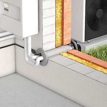 Die DOYMAfix® HP/O-S ist eine oberirdische Wanddurchführung, die speziell für Luft-Wasser-Wärmepumpen in Split-Bauweise konzipiert wurde. Aufgrund ihrer technischen Eigenschaften eignet sie sich ebenfalls hervorragend für die Leitungseinführung bei Klimaanlagen.
