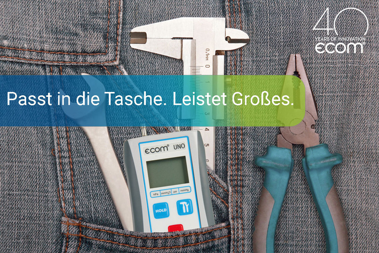 Mit seinen handlichen 106 x 65 x 28 mm passt das ecom-UNO in jede Tasche – und dankt integriertem Magnet haftet es bequem an Metalloberflächen. Flexibel bleiben Sie auch bei den Messeinheiten: Einfach umschalten zwischen hPa/ mbar, mmH2O, mmHg oder psi.