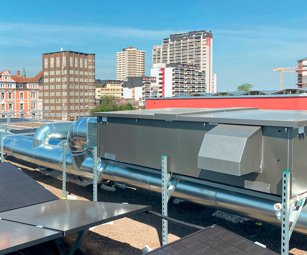 Bei der Planung des Kanalnetzes von zentralen Lüftungsanlagen ist es sinnvoll, die Luftleitungen möglichst kurz zu halten. Die Räume, aus denen die Luft abgesaugt wird, sollten innerhalb des Gebäudes möglichst nah beieinander liegen, um zusätzliche Steigleitungen oder lange horizontale Leitungen zu vermeiden. Das verringert den Material- und Kostenaufwand. Auch sollte die externe Pressung so gering wie möglich sein, um für effiziente Strömungsverhältnisse zu sorgen. Denn je höher die externe Pressung innerhalb des Kanalsystems, desto höher die Ventilatorleistung der Lüftungsgeräte. Letztere steigt dabei allerdings nicht linear, sondern exponentiell, was die Energieeffizienz der Raumlufttechnischen Anlage senkt und Kosten unnötig in die Höhe treibt.