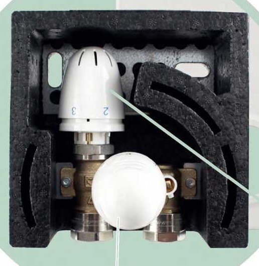 Geliefert wird ein Einbauset zur Unterputzmontage mit Einbaubox aus EPP und mit weißer Abdeckplatte. Optisch zeitlos gestaltet und passend für jedes Zimmer. Für die optimale Funktion wird ein Einbau nach circa der halben Heizkreislänge der Fußbodenheizung empfohlen. Der Rücklauftemperaturbegrenzer regelt die Durchflusstemperatur für die Fußbodenheizung, damit eine angenehme Oberbodentemperatur erreicht wird. Mit dem zweiten integrierten Thermostatkopf kann die gewünschte Raumtemperatur beguem eingestellt werden. Somit ist eine Kombination aus Flächenheizung und Radiatorenheizung ohne zusätzlichem Verteilkreis kostengünstig möglich.