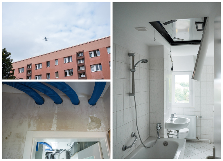 Insgesamt 144 Wohnungen mussten wegen der Nähe zum Flughafen BER Berlin/Brandenburg unter Berücksichtigung von Schallschutzmaßnahmen saniert werden. Um den Mietern ein permanentes ruhiges Wohnen trotz Flughafennähe zu ermöglichen, förderte der Flughafen BER in diesen Wohnblöcken den Einbau neuer Fenster und Wohnraumlüftungsanlagen. Dabei entschied sich der Bauherr für PluggPlan, das einheitszentrale Wohnraumlüftungssystem mit Wärmerückgewinnung von Pluggit.
