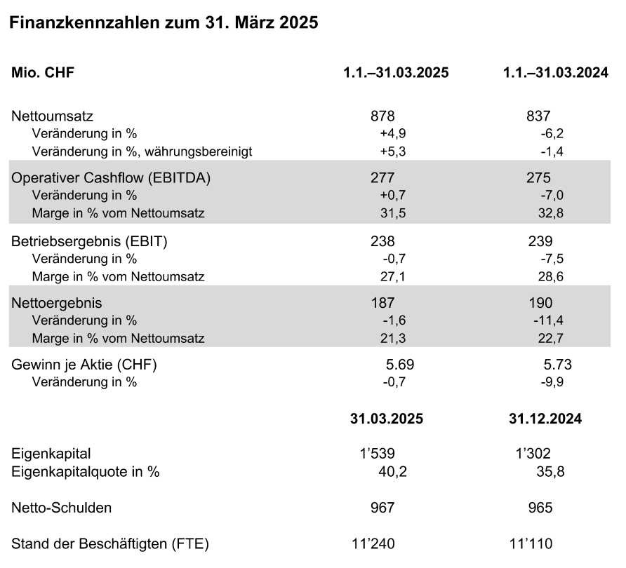 Die Geberit Gruppe erzielte im ersten Quartal 2025 in einem weiterhin sehr anspruchsvollen Umfeld starke Resultate. Die ersten drei Monate des Jahres waren geprägt durch einen deutlichen Volumenanstieg und - unter Ausklammerung der Einmalkosten für die Schliessung eines Werks - auf hohem Niveau gehaltene operative Margen. Der Nettoumsatz stieg um 4,9% auf CHF 878 Mio., währungsbereinigt um 5,3%. Der operative Cashflow (EBITDA) belief sich auf CHF 277 Mio. bei einer EBITDA-Marge von 31,5%; der Rückgang der Marge um 130 Basispunkte ist vollständig auf die vorerwähnten Einmalkosten zurückzuführen. Der Gewinn je Aktie ging um 0,7% auf CHF 5.69 zurück; bereinigt um die Einmalkosten hätte eine Zunahme von 5,6% resultiert.