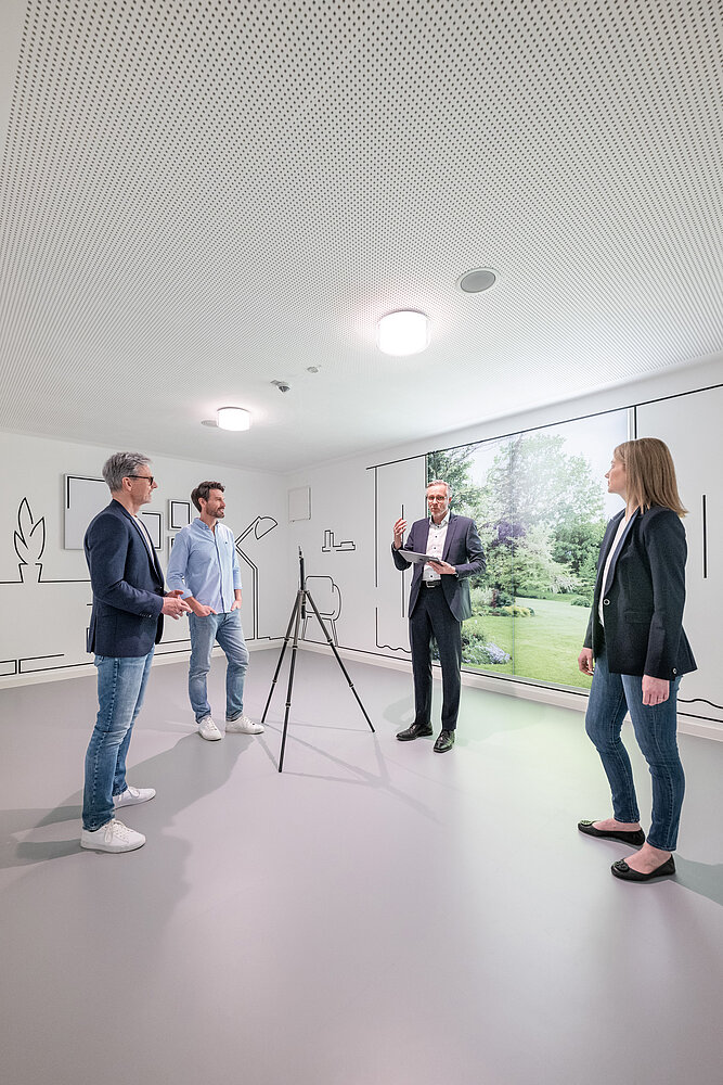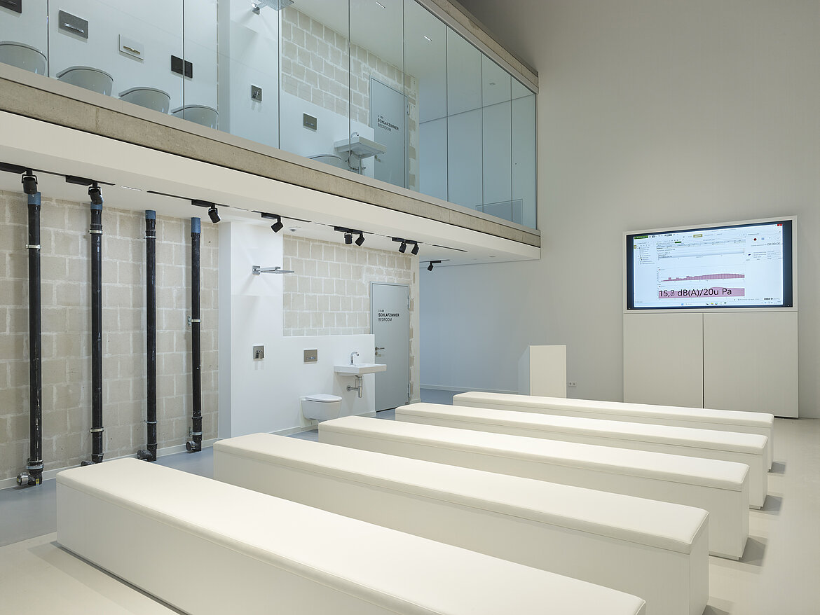 Für ein Schallerlebnis ohne jegliche Beeinflussung von außen ist der Akustik-Kubus baulich komplett vom Rest des Gebäudes abgetrennt. Damit wird eindrucksvoll und unverfälscht erlebbar, wie stark die Sanitärinstallationen das Ruheempfinden in einem Gebäude prägen. Und wie leise sie sich im Hintergrund halten können, wenn sie richtig geplant und ausgeführt sind.