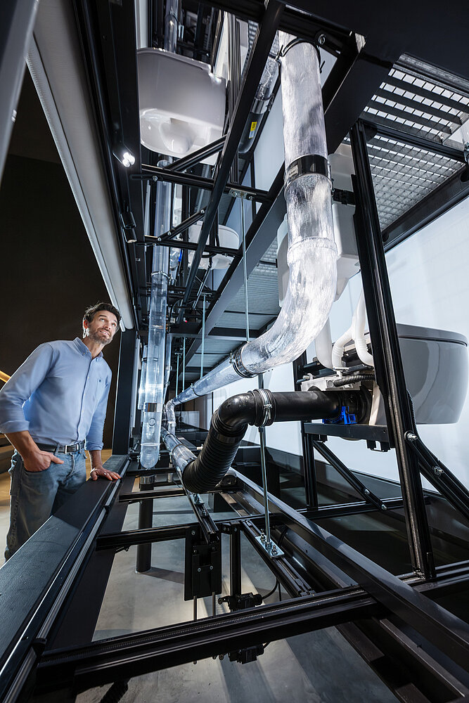 Der Abwasser-Kubus eröffnet neue Perspektiven für die Vorgänge in allen Bereichen der Abwasserhydraulik – von der Gebäude- bis zur Dachentwässerung. Hier lässt sich real in transparenten Rohren direkt nachvollziehen, wie sensibel Entwässerungssysteme auf richtige oder falsche Planung oder Ausführung reagieren. Das neue Didaktikkonzept stellt mehr als 25 typische Situationen der Abwasserhydraulik in den Mittelpunkt. Durch physische Demonstrationen, moderne Lichttechnik sowie multimediale Projektionen wird Wissen anschaulich vermittelt.