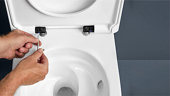Neben der neuen Spültechnik enthalten alle neuen WC-Sets auch WC-Sitze und -Deckel mit Absenkautomatik (SoftClose) und verriegelbarer QuickRelease-Funktion. Die EasyMount-Scharniere erleichtern die Montage erheblich. Sitz und Deckel können damit bequem von oben ausgerichtet und anschließend fixiert werden.