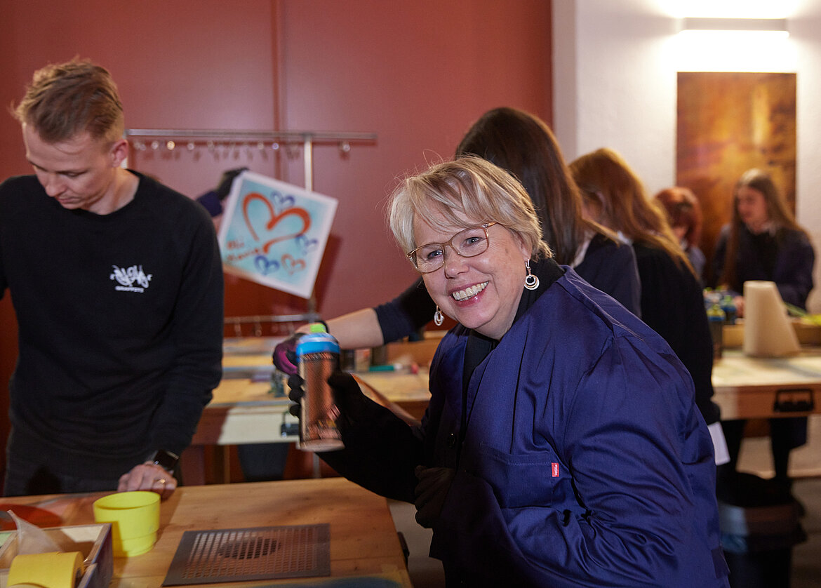 Beim Graffiti-Workshop haben die Besucher die Möglichkeit, zu Sprühdosen und Schablonen zu greifen, um ihre eigenen kreativen Werke auf Papier zu bringen.