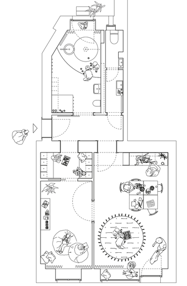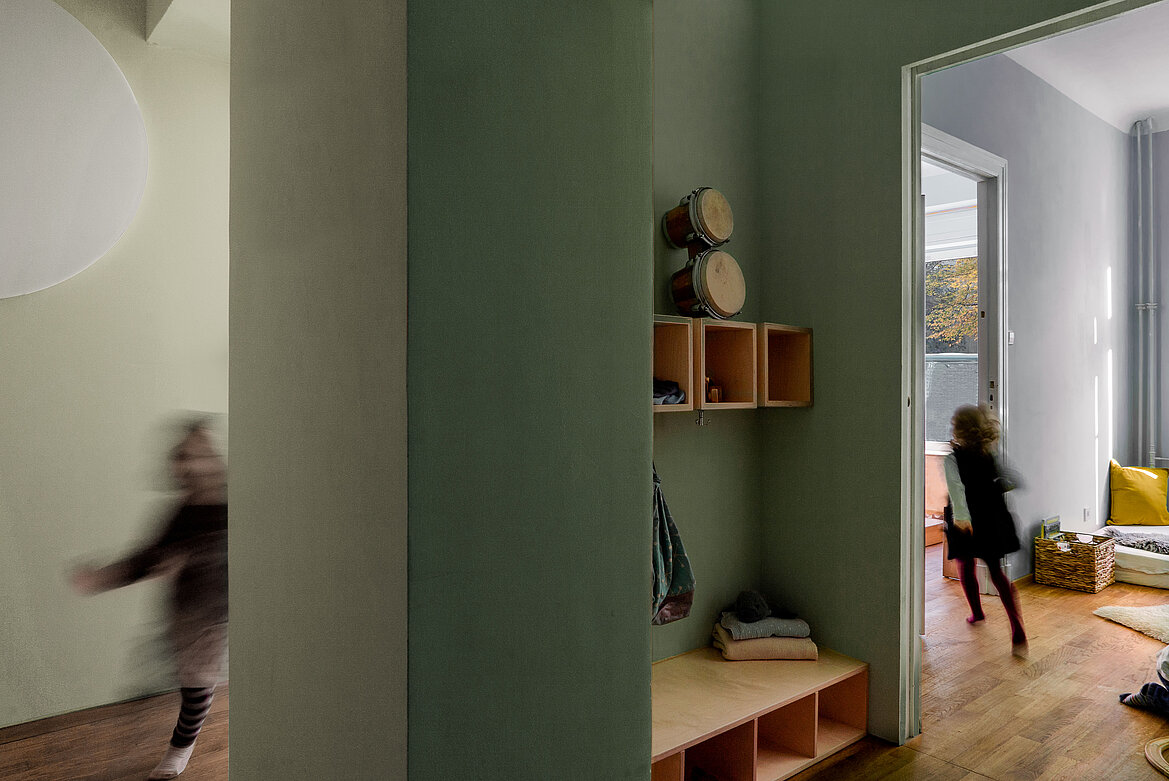In den Plänen der beiden Architektinnen wurde der Leitgedanke durch das Konzept der offenen Laufwege ergänzt. Katja Thorwarth erklärt: „Bewegung ist für kleine Kinder sehr wichtig. Wenn alle Türen offen sind, können die Kinder im Kreis herumrennen, Fangen spielen oder sich verstecken. Auch die Garderobe bleibt kein rein funktionaler Bereich, in dem die Kinder nur ihre Schuhe und Jacken ablegen, sondern wird zum Durchgangs-, Aufenthalts- oder Ruheraum, in dem die Schiebetür nach Bedarf offen oder geschlossen ist.“