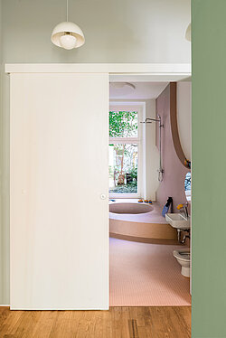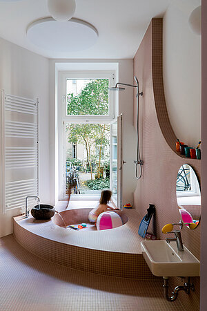 Hinter der Wand im Bad wurde GIS-Profil verlegt und mit Paneelen beplankt. Eine Herausforderung für den Fliesenleger waren die kleinformatigen Mosaikfliesen aus Natursteinzeug in der Farbe Rosé, die stellenweise abgerundet werden mussten, um das Podest, das Kaskadenbecken sowie auch das gesamte Bad auszukleiden. Die Gestaltung mit runder Wanne, runden Armaturen, Spiegel sowie kreisförmiger Vorwandgestaltung ist jedoch kein Zufall: Kreise ziehen sich durch die gesamte architektonische Planung. Freundliche Farben, die die Farbgebung des Vereinslogos des Montessori- Kinderhaus Wedding e. V. aufgreifen, finden sich im Bad wie in den anderen Räumen wieder.