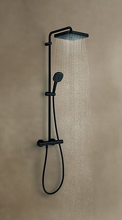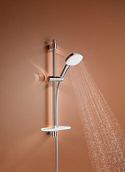 Form und Funktion von Hand- und Kopfbrause sind perfekt aufeinander abgestimmt. Mit dem Grohtherm Thermostat können Anwender:innen mühelos zwischen ihnen wechseln.