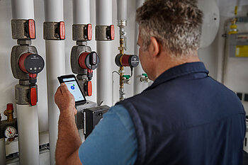 Die verbauten Pumpenmodelle haben sich auch aus der Praxissicht des Installateurs bewährt. "Die Produkte von Grundfos sind leicht zu installieren und dank ihres benutzerfreundlichen Displays auch leicht zu bedienen", urteilt Christof Marschall, Heizungs- und Lüftungstechniker bei Wagner in Ravensburg. Ein besonderer Vorteil ist zudem die einfache Durchführung eines hydraulischen Abgleiches. Dafür hat der Installateur einen Alpha Reader mit der Pumpe verbunden und so die aktuellen Betriebsparameter über die App Grundfos GO an sein Smartphone gesendet. "Grundfos bietet beim gesetzlich vorgeschriebenen hydraulischen Abgleich echte Vorteile", sagt Christof Marschall. "Wir können den Abgleich in Echtzeit mittels App über das Smartphone vornehmen. Hinterher können wir einen Bericht ausdrucken, den der Hausbesitzer beim Antrag auf staatliche Förderung für energiesparende Technologien vorlegen kann."