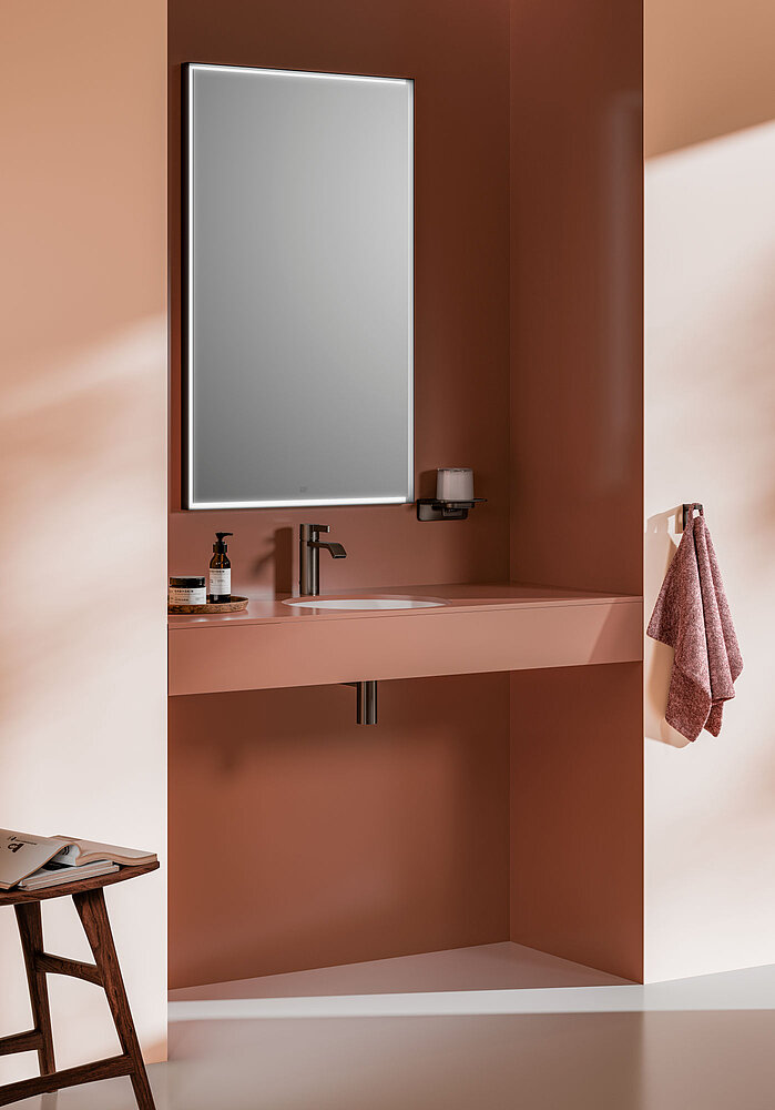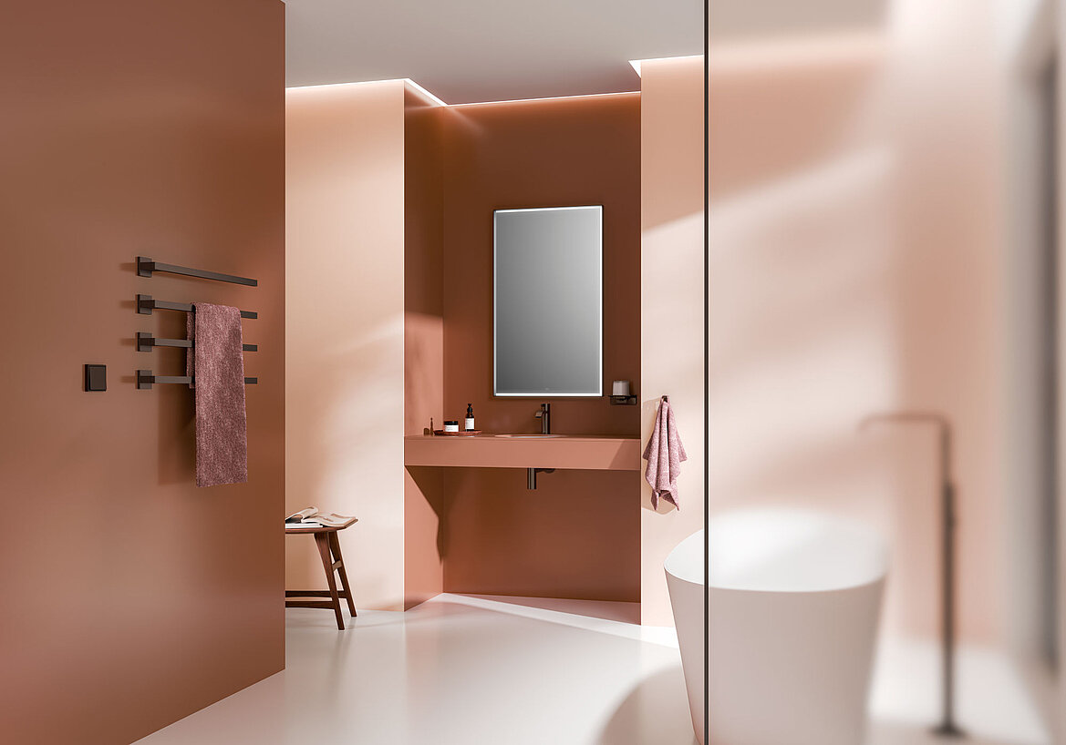 Schlicht und stilbewusst: Badarchitektur im Mocha Mousse-Ton mit IMO-Armatur und eckigem Handtuchwärmer in Dark Platinum gebürstet, ergänzt um einen passenden Lichtspiegel in Schwarz. Produktdesign: Sieger Design Copyright: Dornbracht