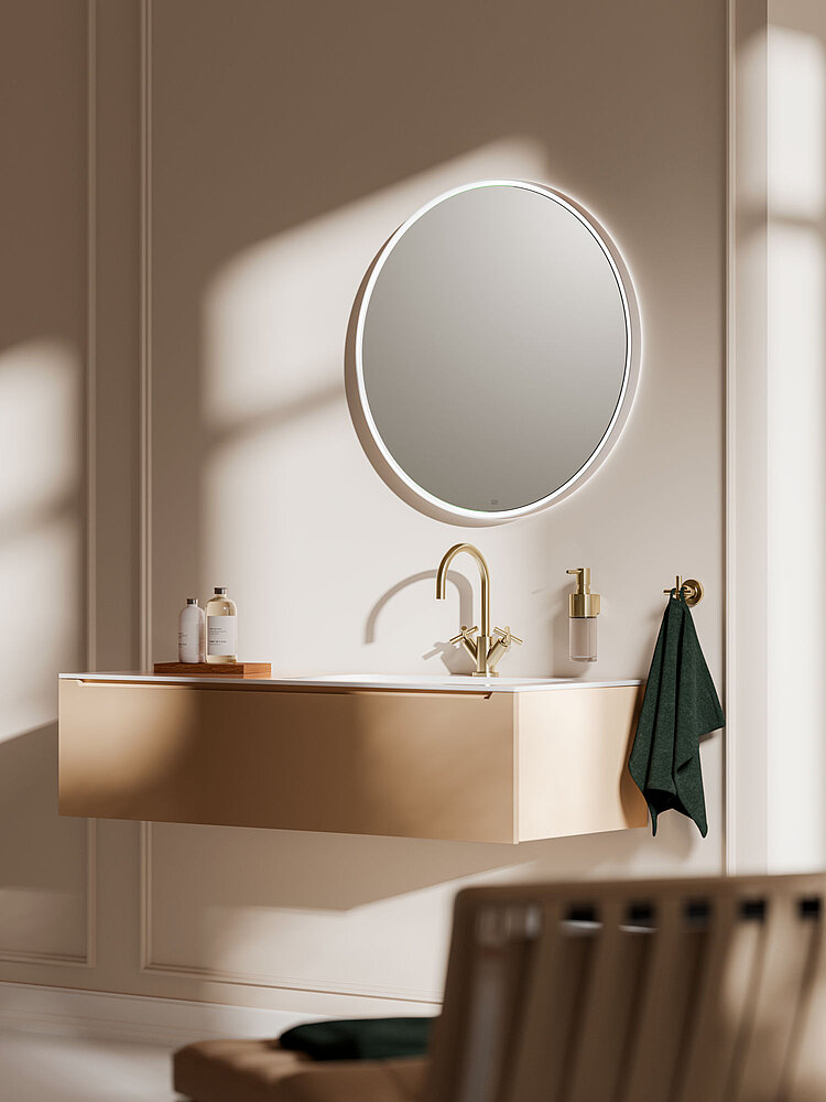 Die Badneuheiten umfassen außerdem Lichtspiegel mit umlaufender LED-Beleuchtung. Zwei Touchfelder ermöglichen hier das einfache An- und Ausschalten per Berührung, das Ändern der Farbtemperatur von kalt zu warm und ein stufenweises Dimmen des Lichts. Die eleganten, reduziert gestalteten Spiegel gibt es in den Oberflächen Schwarz und Weiß, in runder und eckiger Form sowie einer kleinen und größeren Ausführung.