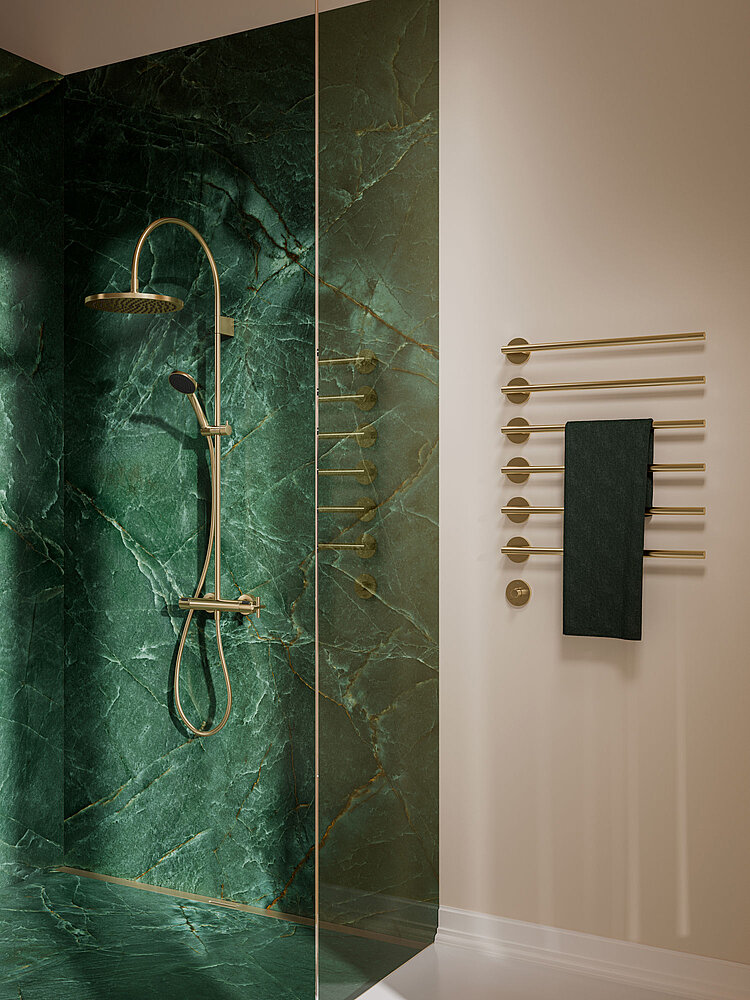 Ein besonderes Highlight unter den Produktneuheiten sind die elektrischen Handtuchwärmer. Sie wurden exklusiv für Dornbracht in Zusammenarbeit mit Zehnder – einem Experten für Bad- und Design-Heizkörper – entwickelt. Die Gestaltung stammt von Sieger Design. Sie greift stilistische Elemente bestehender Dornbracht-Serien auf. Die Handtuchwärmer sind in eckiger oder runder Ausführung erhältlich. Je nach Raumsituation können sie nach links oder rechts ausgerichtet und in zwei Größen (vier oder sechs Heizstäbe) eingebaut werden. Da sie rein elektrisch betrieben werden, entfällt die Notwendigkeit einer Entlüftung. Für die individuelle Badgestaltung steht eine breite Palette an Oberflächen zur Auswahl – von Chrom über Champagne gebürstet (22kt Gold) bis hin zu Schwarz matt.