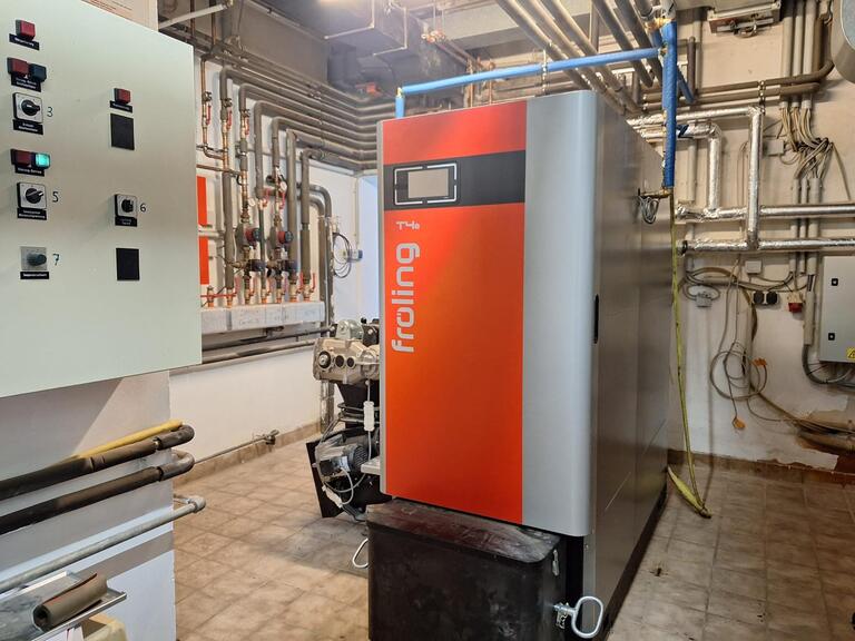 die mit der neuen Fröling Hackgutheizung T4e mit 180 kW beheizt werden. Der Hackschnitzeltransport erfolgt über das vier Meter lange Federblattrührwerk und die Befüllung des Lagerraums wird durch ein Bunkerbefüllsystem aus dem Hause Fröling unterstützt.