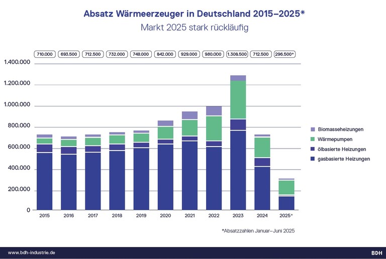 Die deutsche Heizungsindustrie verzeichnet auch im ersten Halbjahr 2025 einen deutlichen Rückgang der Verkaufszahlen. Nach dem massiven Absatzeinbruch um 46 Prozent im Jahr 2024 sank der Absatz in den ersten sechs Monaten dieses Jahres nochmals um 22 % auf nur noch 296.500 Geräte. Sollte sich dieser Trend fortsetzen, droht der Branche das schlechteste Jahresergebnis der vergangenen 15 Jahre.