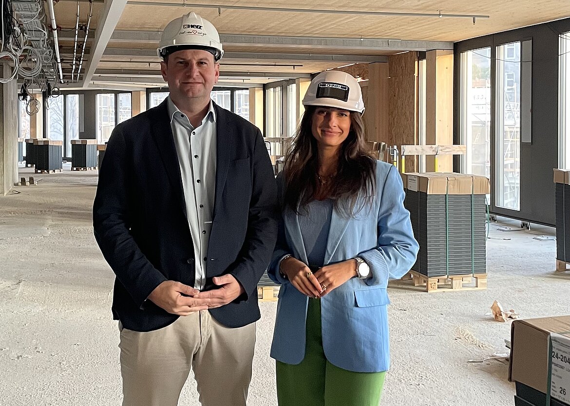 Christian Bundschuh: Das Projekt besteht aus mehreren Wohnbauten und einem Bürogebäude mit zehn Etagen. Wir als Ortner sind für die Haustechnikanlage des Bürogebäudes zuständig. Das Besondere an dem Projekt ist die Holz-Hybrid-Bauweise. Dabei besteht der Kern aus Stahlbeton, die tragenden Bauteile Richtung Fassade sind aus Holz. Es ist eine Methode, die in der Branche noch selten anzutreffen ist, scheint aber die Zukunft zu sein.