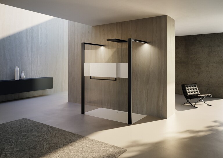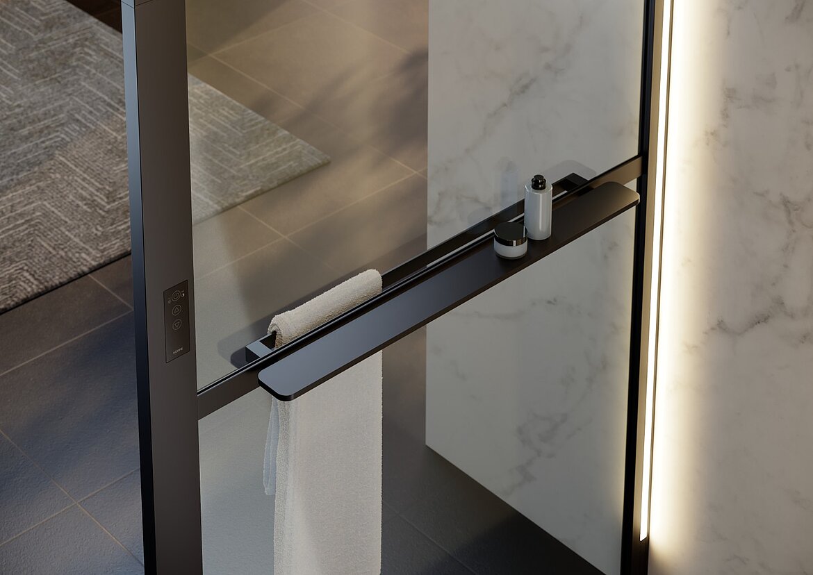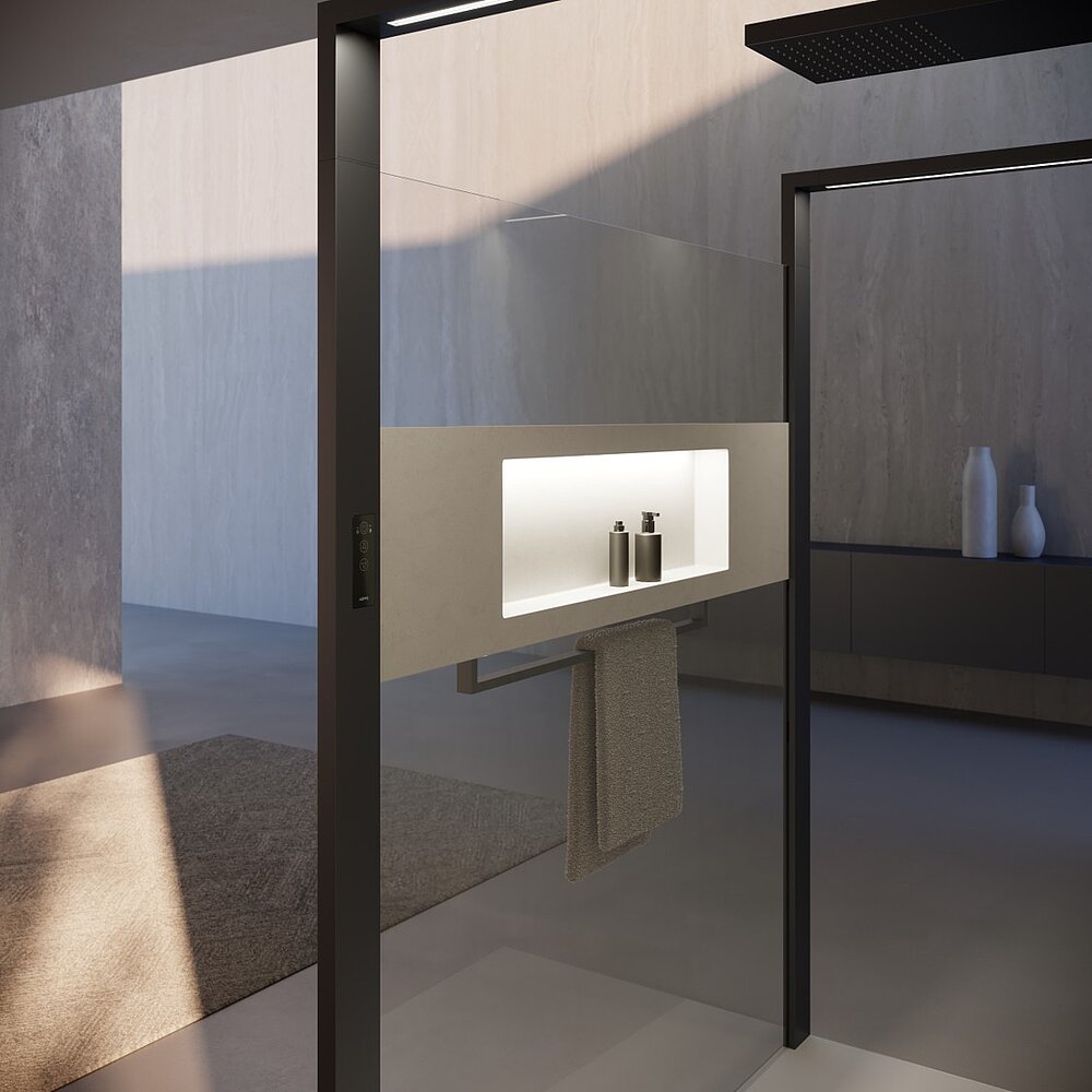 Auf kleinen Grundrissen – zum Beispiel im Kontext vom Micro Living – übernimmt Hüppe Sphere die Rolle als zentrales Einrichtungsobjekt. Denn im Alltag des Wohnens präsentiert sich das System als überaus smart und raffiniert, indem es sowohl an der Innen- als auch an der Außenseite eine Vielzahl komfortabler Funktionen integriert und dabei höchste Ansprüche an die Funktionalität im Bad erfüllt. Dazu gehören verschiedene Accessoires und Ablagesysteme vom Handtuchhalter und einfachen Tablet über eine großzügige, dezent beleuchtete Ablagenische, die Hüppe Wallbox, in der diverse Duschutensilien ihren Platz in Griffweite finden, bis hin zu verschiedenen Möbeln und Spiegeln an der Außenseite. Optional in Querbügel und Wandleisten sowie Hüppe Wallbox eingelassene LED-Lichtsysteme, deren Lichtstärke und -farbe sich über ein Touchdisplay steuern lassen, sorgen für eine angenehme Raumstimmung. Künftig werden auf Wunsch integrierte Heizfolien, die ebenfalls per Fingerdruck auf dem entsprechend erweiterten Display bedient werden, zudem dafür Sorge tragen, dass am Duschplatz stets eine angenehme Temperatur herrscht und auf der Außenseite hängende Handtücher angewärmt werden. Noch mehr Bedienkomfort ist durch die Einbindung der Licht- und Wärmeelemente über eine binäre IO-Schnittstelle in gängige Smart-Home-Systeme möglich. „Welche Funktionalitäten den Duschkomfort anreichern und die Aufenthaltsqualität im Bad erhöhen sollen, lässt sich mit Hüppe Sphere ganz flexibel nach individuellen Bedürfnissen und Wünschen bestimmen“, sagt Hüppe Produkt- und Entwicklungschef Tattersall.