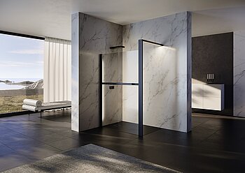 Hüppe Sphere bringt eine bislang unbekannte Vielfalt an Materialität und Farbigkeit an den Duschplatz. In einem Trägersystem aus Metallprofilen kombiniert Hüppe Sphere Module aus Glas und dem natürlichen, haptisch überaus angenehmen Mineralwerkstoff Solid Surface miteinander. Dabei sind verschiedene Kombinationsmöglichkeiten realisierbar: von der komplett geschlossenen Trennwand über teiltransparente Varianten bis hin zur reinen Echtglasfront – ganz nach dem Grad der gewünschten Intimität.