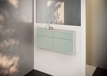 Für die Raumgestaltung und Raumwirkung ist dabei entscheidend, dass die Module aus hochwertigem Mineralwerkstoff in verschiedenen Farben und – ebenso wie die Glasmodule – in unterschiedlichen Oberflächentexturen verfügbar sind. Standardmäßig stehen sie in den Tönen Anthrazit, Snow (Schnee) und Cream (Cremefarben) zur Verfügung. Auf Anfrage lassen sich die Module zudem in weiteren Oberflächen anfertigen. Zudem beschichtet die unternehmenseigene Hüppe Oberflächenmanufaktur die Metallprofile des Trägersystems und Accessoires wie etwa die Handtuchstange in allen RAL-Farben – unter anderem in den besonders angesagten Farbtönen „Black Edition“ (mattschwarz), „White Edition“ (mattweiß), „Gold Edition“ sowie in den metallischen Oberflächen Bronze, Schwarzchrom, Messing und in Edelstahloptik. Darüber hinaus bekommt man auch die Glasmodule in unterschiedlichen Tönungen. Ebenso sind die Fronten der an der Außenseite von Hüppe Sphere integrierbaren Möbel in unterschiedlichen Oberflächen und Farben erhältlich: Neben den Standardoberflächen alpinweiß, lichtgrau und Eichenoptik sind auch hier andere Farbgestaltungen auf Anfrage möglich.