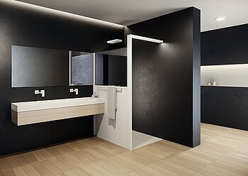 Dies gilt umso mehr, als Hüppe Sphere der Gestaltung des Raumlayouts ganz neue Ansätze eröffnet. Denn im Unterschied zu herkömmlichen Duschabtrennungen nutzt das Modulsystem auch die Außenseite für die Integration hilfreicher Funktionen wie zum Beispiel Spiegel, Handtuchhalter, Handtuchwärmer, Ablagen oder Möbel. Derart verbindet Hüppe Sphere den für persönliche Wellness und intime Körperpflege vorgesehenen Ich-Bereich des Bads mit dem Wir-Bereich, in dem das Miteinander und wechselseitige Interaktion stattfinden. Dort wo großzügig geplant werden kann, eignet sich Hüppe Sphere daher hervorragend zur Zonierung und Raumtrennung – und dies, ohne dass in aufwändiger Arbeit mehrerer Gewerke Mauern oder Trennwände hochgezogen werden müssen. Gerade dort, wo fließende Übergänge in andere Bereiche des Wohnens jenseits konventioneller Lösungen geschaffen werden sollen, lassen sich mit Hüppe Sphere innovative Raumkonzepte umsetzen.