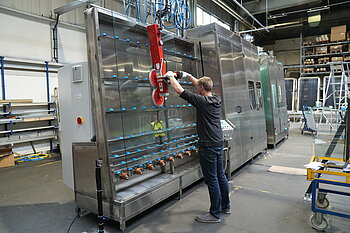In dieser Woche hat der Sanitärhersteller eine neue Anlage in Betrieb genommen, die das Glas von Hüppe Duschkabinen und -abtrennungen in einem innovativen Verfahren mit einer ultradünnen Anti-Plaque-Beschichtung veredelt. Diese von Hüppe 1996 als Pionier entwickelte Spezialversiegelung verhindert, dass sich Schmutz und Kalk auf der Glasfläche festsetzen können, und minimiert so den Reinigungsaufwand deutlich. „Dies ist ein zentrales Qualitätsmerkmal unserer Produkte aus Echtglas. Mit der neuen Beschichtungsanlage sind wir nicht nur auf dem aktuellen Stand der Technik, sondern wir können jetzt anders als bisher doppelseitig beschichten – ein echter Effizienzgewinn, der wichtig für unsere internationale Wettbewerbsfähigkeit ist“, freut sich Hüppe Chef Henco.