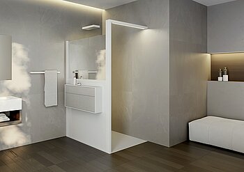 Neuartige Produktkategorie: Die modulare Systemlösung Hüppe Sphere, hinter der mehrere zum Patent angemeldete Innovationen stecken, gibt mit ihrer Kombination aus Glas- und Mineralwerkstoffmodulen in unterschiedlichen Oberflächen und Farben dem Interior Design zahlreiche zusätzliche Optionen für eine individuelle Raumgestaltung an die Hand. © Hüppe GmbH