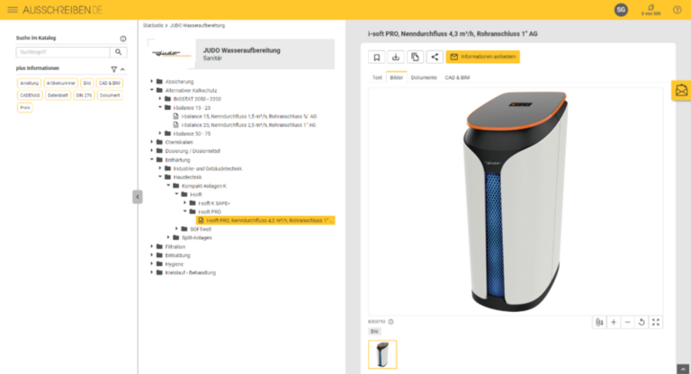 Mit der neuen Schnittstelle zu JUDO profitieren Interessenten von einem schnellen und unkomplizierten Zugriff auf sämtliche notwendige Daten. Die tägliche Datenbeschaffung für Planungsprojekte mit den WunschWasser-Experten wird durch die Bereitstellung des umfassenden Herstellerkatalogs deutlich vereinfacht. Interessenten aus unterschiedlichen Bereichen – inklusive der Wasseraufbereitung – erhalten einen aktuellen Überblick zu den passenden JUDO-Produkten und müssen die einzelnen Informationen nicht erst umständlich recherchieren. Produktdatenblätter, Bilder und weitere Dokumente wie Montage- und Betriebsanleitungen lassen sich so einfach in die Planungsunterlagen übertragen. Als momentan einziger Hersteller der Wasseraufbereitung stellt JUDO BIM-Planungsdaten und aktuelle Listenpreise als erste Orientierung zur Verfügung.