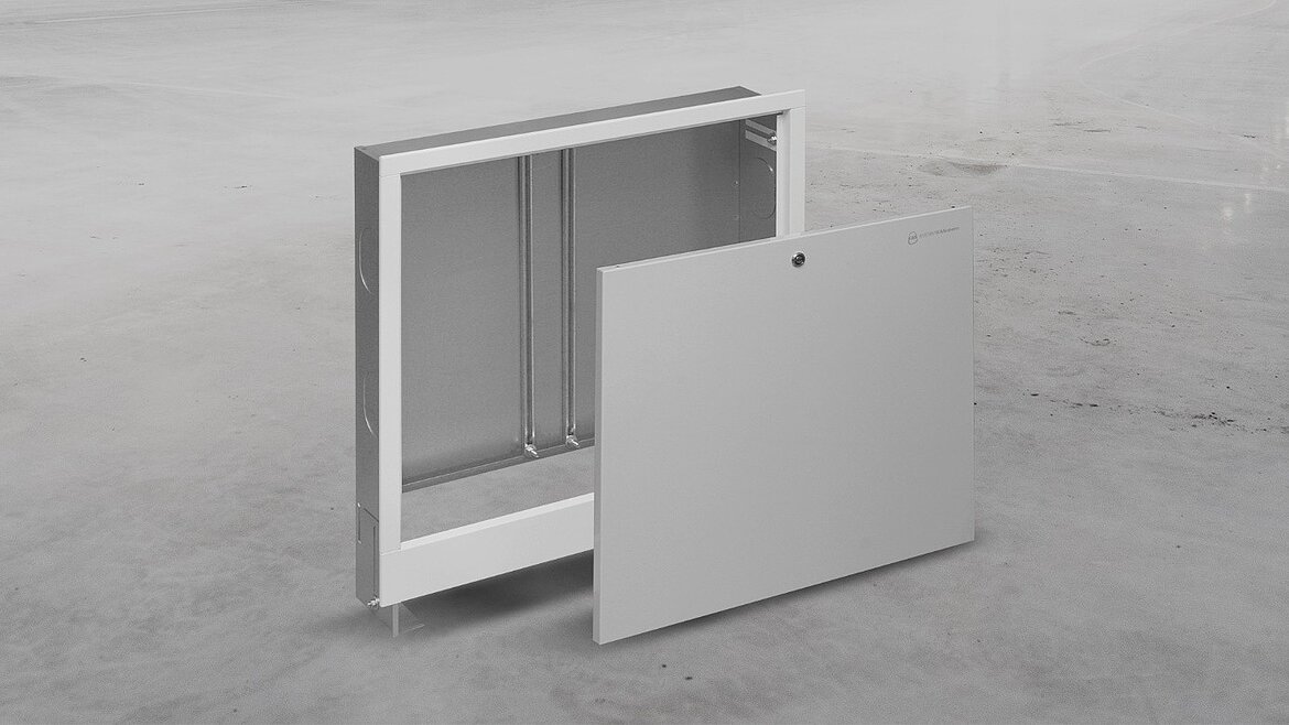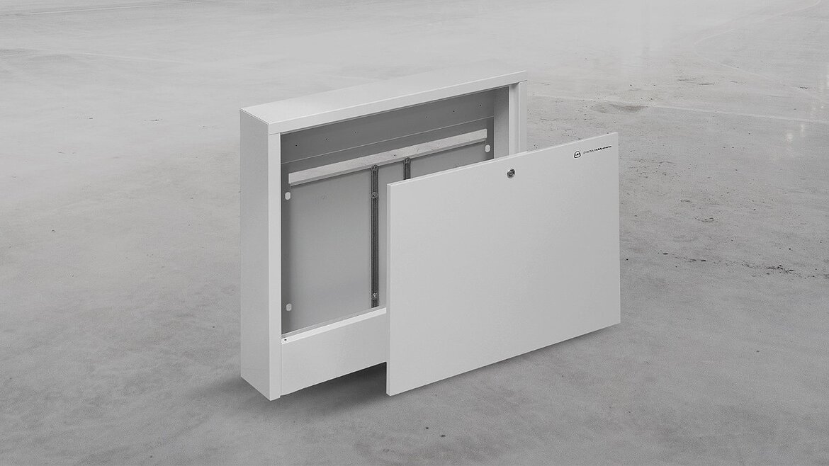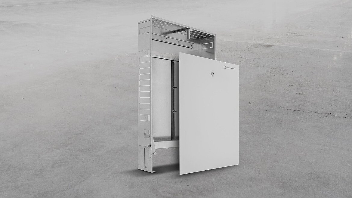 Flach UP, inklusive Hutschiene auf der Rückwand des an den seitlichen Wänden und im Dach umfassen für Anschlüsse perforierten und höhenverstellbaren Wandeinbauelements in sechs Breiten von 450 bis 1200 mm, einer Tiefeverstellung des Rahmens von 80-120 mm und einer Höhe von 750-850 mm