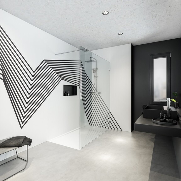 Die RenoDeco Oberflächen wirken wie aus einem Guss. Graphische Linien sorgen hier für einen eleganten, futuristischen Look und passen hervorragend zum Bäder-Trendthema Schwarz. Bildnachweis: HSK Duschkabinenbau KG