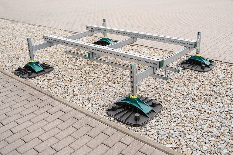 So überzeugt etwa das neue Montagesystem zur Dachaufständerung mit BigFoot-Stellfüßen durch durchdachte Technik, einfache Handhabung und zuverlässigen Schutz der Bausubstanz. Weil die gesamte Konstruktion nicht mit dem Gebäude verschraubt werden muss, bleibt die Dachmembran geschützt und das Risiko von Undichtigkeiten wird reduziert. Eine integrierte Antivibrationsmatte minimiert Trittschall und erhöht den Komfort in darunterliegenden Räumen. Die BigFoots ermöglichen eine optimierte Lastverteilung und reduzieren Punktlasten. Sie sind bis zu einem Neigungswinkel von 7° verstellbar und passen sich flexibel an unterschiedliche Dachneigungen an. Ein unter dem Rahmen angebrachtes