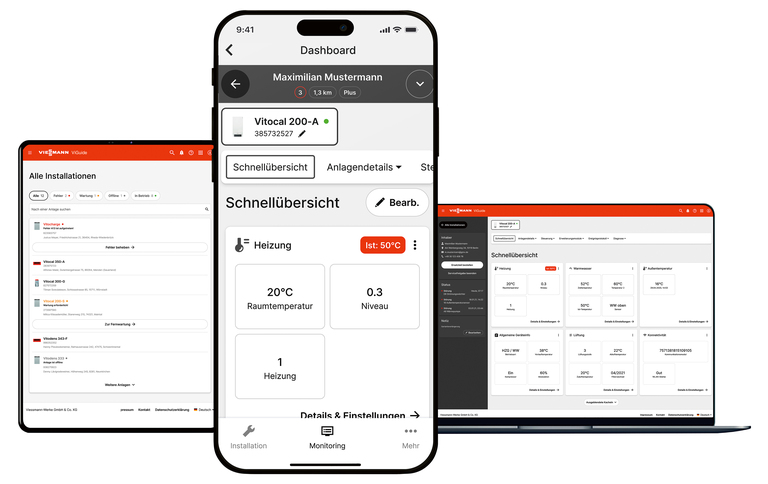 Für eine schnelle Reaktion im Störfall nutzt der Fachpartner ViGuide Pro. Online hat er die Energiesysteme seiner Kunden im Blick. Algorithmen unterstützen ihn beim Erkennen von Anomalien im laufenden Betrieb – noch bevor es zu einer tatsächlichen Störung kommt. Oft lassen sich dann Parameter korrigieren, ohne zum Standort der Anlage fahren zu müssen. Neu ist das permanente Monitoring des Stromspeichers Vitocharge VX3, bei dem viele Parameter online angezeigt werden. Somit profitiert der Anwender vom bestmöglichen Service für sein komplettes Energiesystem aus einer Hand.